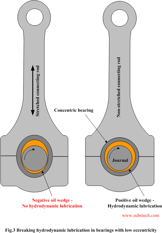 Bearing eccentricity should be designed to compensate for the distortions of bearing housing bores caused by the forces applied to the connecting rod and to the crankcase. Bearing eccentricity should enable and allow for the creation and retention of a wedge shaped oil gap, which is required in order to produce a hydrodynamic lubrication regime. (Fig.4).