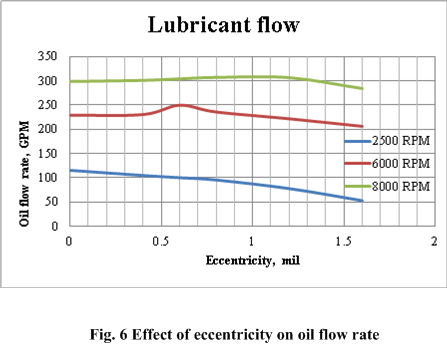 The calculations show that at 8000 RPM the parameters of hydrodynamic lubrication remain responsive to the amount of eccentricity. In fact, the maximum value of minimum oil film thickness (Fig.5) was achieved at a greater value of eccentricity (1.2 mil). The absolute level of minimum oil film thickness was also the highest. The oil peak pressure grew more gradually than at lower speeds. The effect of eccentricity on the oil flow rate (Fig.6) is negligible.