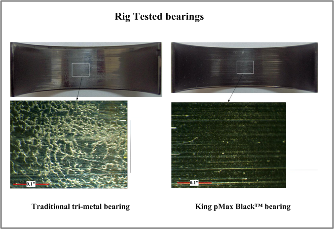 At the same time, the properties of excellent seizure resistance, conformability and embedability – which are characteristics of soft overlays – are preserved. This new overlay, called pMax Black™, has proven its effectiveness in increasing the fatigue strength of high performance tri-metal bearings. All King XP series high performance bearings are manufactured with this hardened pMax Black™ overlay. These bearings are easily recognizable by their distinctive dark color.