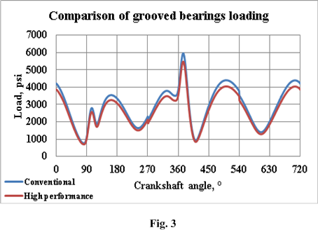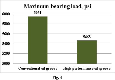 The greater effective area of the modified (high performance) bearing resulted in lower loads as compared to the bearing with the conventional groove design. The values of the maximum loads are shown in Fig.4.