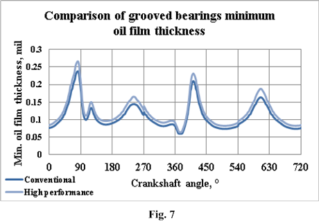 As seen from the graphs, the new groove design provides lower values of peak oil film pressure at any position of the crankshaft. The difference between the two designs is the most significant (~15-20%) when the specific load reaches the maximum values (Fig.6).